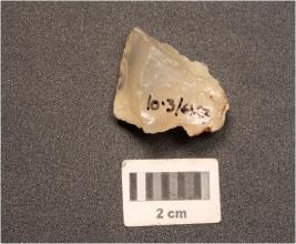 | Description / विवरण | Side scraper made on stone flake with flake scars on dorsal side and diffused bulb on ventral side, irregular retouched marks along cutting edges. |
