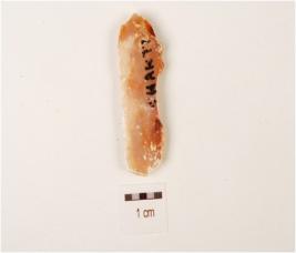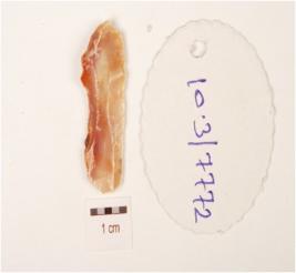 | Description / विवरण | A blade, made on chert with double ridge on dorsal, prepared platform, bulb on ventral, trapezoidal in section and use wear marks on cutting edge. |