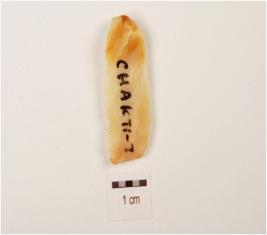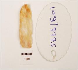 | Description / विवरण | A blade, made on chert with double ridge on dorsal side, prepared platform, bulb on ventral side, use-wear marks on cutting edge and trapezoidal in section. |