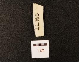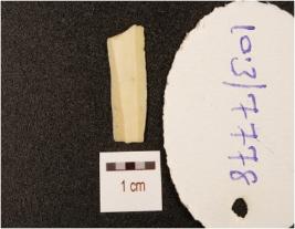 | Description / विवरण | Fragment of a chert blade with double ridge on dorsal side, trapezoidal in section and use wear marks on cutting edge. |