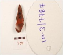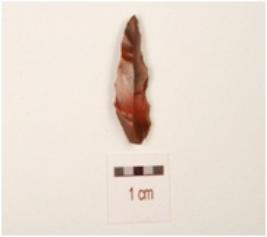 | Description / विवरण | A point, made on chert with prominent single ridge on dorsal side, pointed distal end, irregular retouches on edge, triangular in section, prepared platform and bulb on ventral. |
