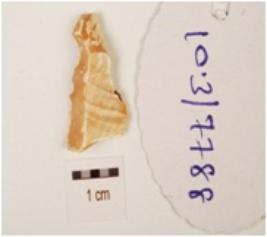 | Description / विवरण | A blade, made on chert with prominent mid ridge on dorsal side, use-wear marks on cutting edge and triangular in section. |
