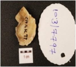 | Description / विवरण | A flake, made on chert with flake scars on dorsal side, cortex on dorsal side and trapezoidal in section. |