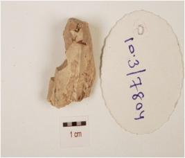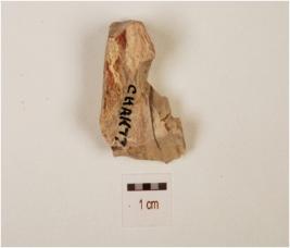 | Description / विवरण | A core, made on chert with five blade scars on surface and prepared platform. |