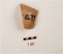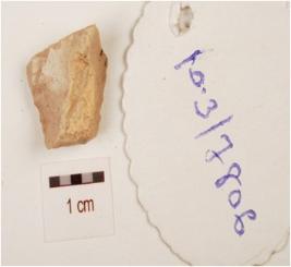 | Description / विवरण | A utilized flake, made on chert with flake scars on dorsal side, prepared platform and bulb on ventral side, use wear marks on edge. |