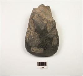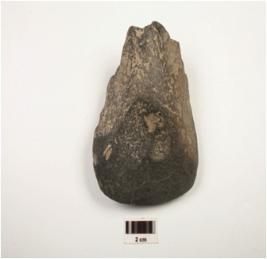 | Description / विवरण | Fragment of axe made of dolerite with broad working edge, triangular shaped, sharp edge, heavy and thick ends and oval cross section. |