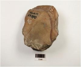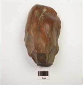 | Description / विवरण | Chopping tool made of chert pebble with butt end on posterior, alternate flake scars and sharp wavy cutting edge. |