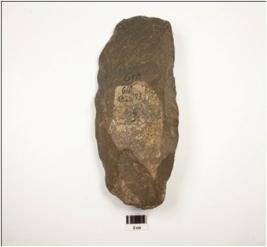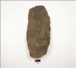 | Description / विवरण | A cleaver made of quartzite with end struck flake, flake scars on dorsal rectangular shaped, longitudinal side, wavy sharp working edge and lenticular cross section. |