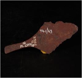 | Description / विवरण | A copper spear head. Surface is pointed and sharp, edges are broken, handle is long surface and corroded. |
