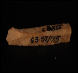 | Description / विवरण | Fragment of blade, made of chert. Parallel sided blade with double ridge in dorsal portion, trapezoid section. Prominent bulb is visible. |