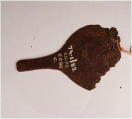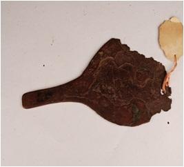 | Description / विवरण | Copper piece of spear head. Thin in character and edges are corroded. Hands is pointed. |