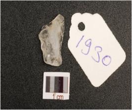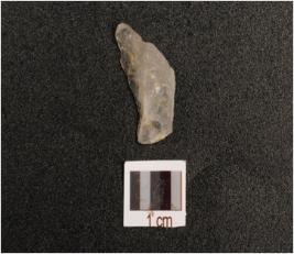 | Description / विवरण | Quartz flake with prepared platform, diffused bulb on ventral side and use wear mark along cutting edges. |