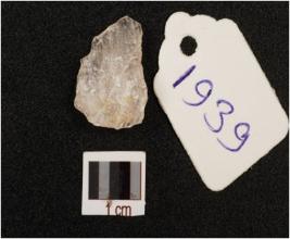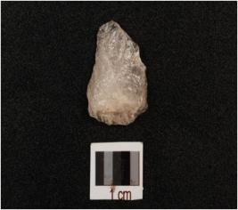| Description / विवरण | Quartz flake with prepared platform, diffused bulb on ventral side and usewear marks along cutting edges. |
