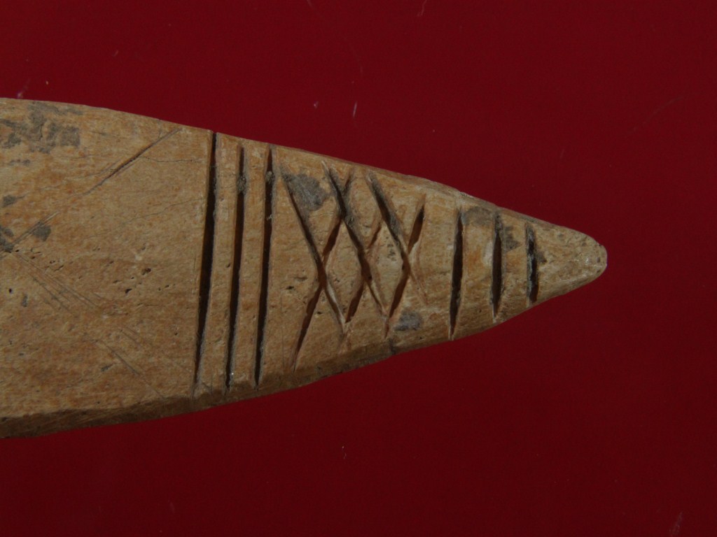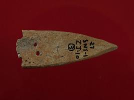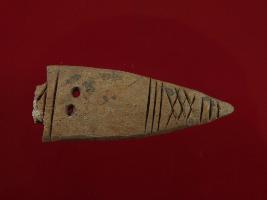 Trench ZJ- 10, Layer 3 This is an arrow-head made of bone. It has a design on its obverse side. The design has line incisions on the top with a criss-cross design in the centre. It has two holes for the stick to tie with the thread. Surface is porous and lustrous. Colour is cream.