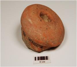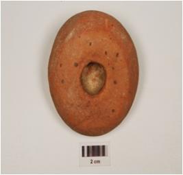 | Description / विवरण | A handmade terracotta dabber has hole in the centre. |