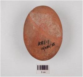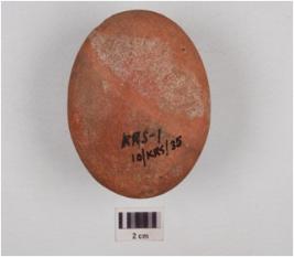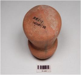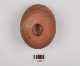 | Description / विवरण | A terracotta dabber, has solid handle with hole in the centre, round base, surface treated with red slip and well baked. |
