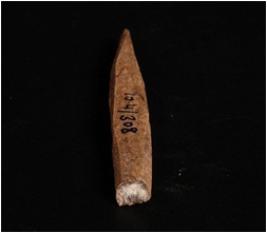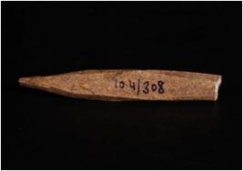 | Description / विवरण | Bone point with flattened surface and tapered on one end, Tip of one side is pointed and broken from another side, rectangular in section and well polished surface. |