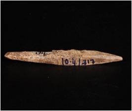 | Description / विवरण | Bone point with ridges on four sides and tapered on both ends, smooth surface, pointed ends, middle surface is thick, long narrow ends and polished towards the pointed poration. |