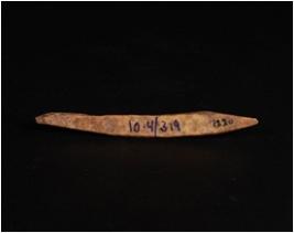 | Description / विवरण | Bone point with ridges on three sides and tapered on both ends, long narrow, pointed both ends, flattened from one side and rubbing and polishing seen towards their pointed. |