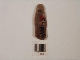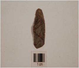 | Description / विवरण | A knife shaped chert blade, flake marks on dorsal surface, irregular edges, prominent bulb on ventral surface. |