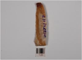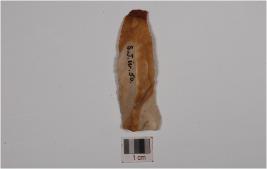| Description / विवरण | A blade made on chert, has prepared platform on the proximal end, ridge on the dorsal, and use wear marks on the cutting edges. |