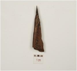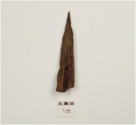 | Description / विवरण | A fragment of arrowhead made on charrel bone,pointed at one end and flat on other ,well polished and smooth surface. |
