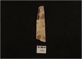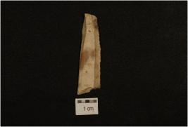 | Description / विवरण | Fragment of blade made on chert, prepared platform prominent bulb on ventral side, two ridges on dorsal side, trapezoidal cross section and use marks along cutting edges. |