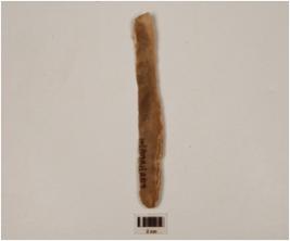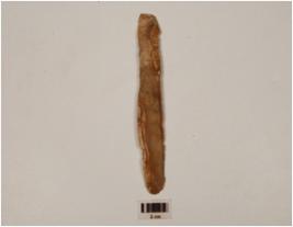 | Description / विवरण | A parallel sided blade made on chert, two ridge on dorsal surface, irregular edges and prominent bulb on proximal end. |