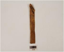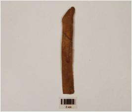 | Description / विवरण | A parallel sided blade made on chert, mid ridge on dorsal surface, use ware edges and broken bulb on ventral side. |