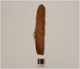 | Description / विवरण | A knife shaped blade made on chert, mid ridge on surface, irregular edges and prominent bulb on distal end. |