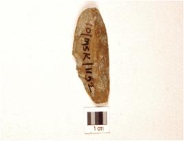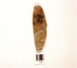| Description / विवरण | A blade made on chert, prepared platform, prominent bulb on ventral, ridge on dorsal. |