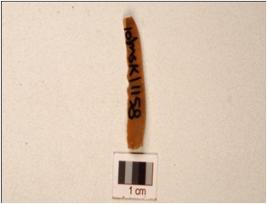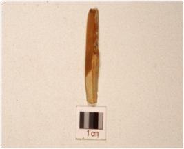 | Description / विवरण | A blade made on chert, prepared platform, prominent bulb on ventral, use wear marks along the cutting edge, and triangular cross section. |