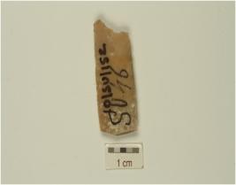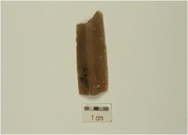 | Description / विवरण | A blade made of chert, mid ridge on dorsal side, diffused bulb on ventral side use wear marks on edges. |