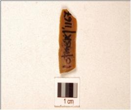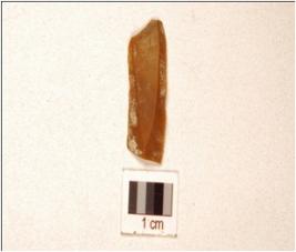 | Description / विवरण | A Blade made on chert, both ends broken, use wear marks along the cutting edge and triangular cross section. |