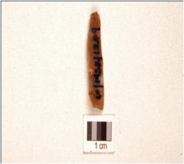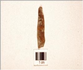 | Description / विवरण | A chert blade prominent mid ridge on dorsal, triangular cross-section and use-wear marks on cutting edge. |