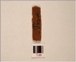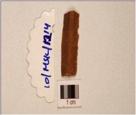 | Description / विवरण | A paralled sided chert blade, double ridge on dorsal, trapezoide cross-section, and use wear marks on cutting edge and broken proximal end. |