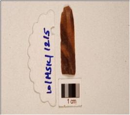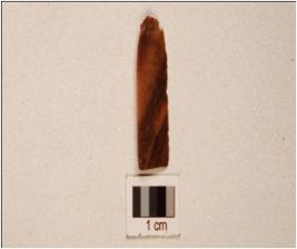| Description / विवरण | A paralled sided chert blade, double ridge on dorsal, trapezoide cross-section, prepared platfrom, bulb on ventral and use wear marks on cutting edge. |