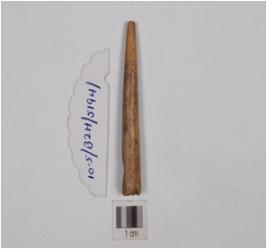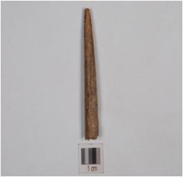 | Description / विवरण | Fragment of point made of bone, circular cross-section, tip is broken, polished surface with incised zig-zag line |
