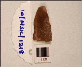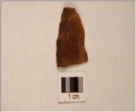 | Description / विवरण | A chert blade, prominent mid ridge on dorsal, prepared platform,bulb on ventral,and use-wear marks on cutting edge. |