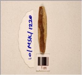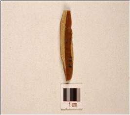 | Description / विवरण | A chert blade, prominent mid ridge on dorsal triangular cross-section, prepared platform, bulb on ventral and use-wear marks on cutting edge. |