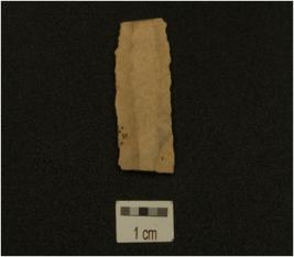 | Description / विवरण | A blade made on chert, mid ridge on dorsal side, diffused bulb on ventral side and use wear marks on edges. |