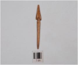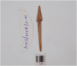 | Description / विवरण | A triangular shaped arrowhead made of bone, barbed and tanged with polished surface. |