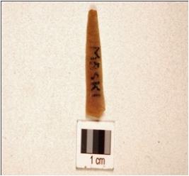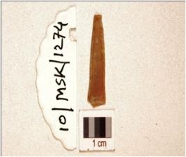 | Description / विवरण | A blade made on chert having prepared platform, prominent bulb on vental trapezoidal cross-section and use-marks along the cutting edges. |