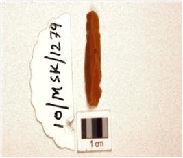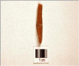 | Description / विवरण | A blade made on chert having mid-ridge on dorsal side, triangular cross section, prepared platform, prominent bulb on ventral and use-marks along the cutting edges. |