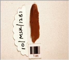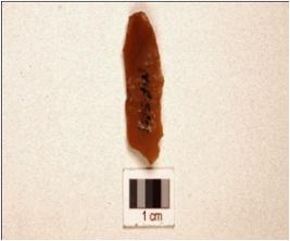 | Description / विवरण | A blade made on chert having prepared platform, prominent bulb on ventral, distan end broken and use-marks along the cutting edges. |