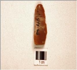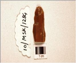 | Description / विवरण | A blade made on chert having two ridges on dorsal, trapezoidal cross-section, prepared platform, prominent bulb on ventral and use-marks along cutting edges. |
