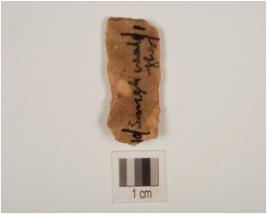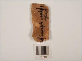 | Description / विवरण | A fragment of chert blade, double ridge on dorsal side, usewear marks along the cutting edge, trapezoidal cross section, prominent bulb on ventral side and smooth surface. |