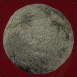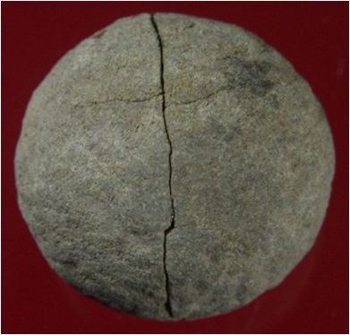 Trench A- 1, Qdt 2, Layer 6 This is a ball made of stone. Shape is round. Surface is rough. It is restored with some adhesive. Appearance is greyish.