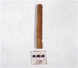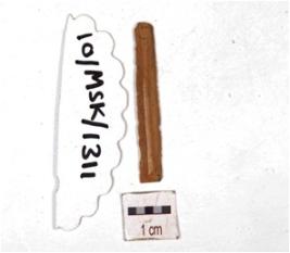 | Description / विवरण | A parallel sided blade of chert with a ridge on the dorsal, use wear marks along the cutting edges and trapezoidal cross-section. |