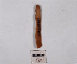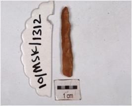 | Description / विवरण | A baked blade of chert with use wear marks along the cutting edges and triangular cross-section. |